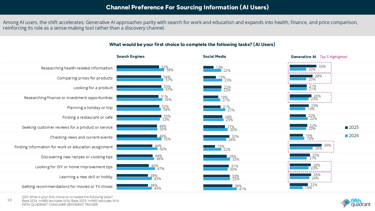 Channel selection is increasingly determined by task requirements. Search engines remain dominant for quick look-ups, transactional queries and routine product searches. These are tasks where speed and precision retrieval are prioritised. Social media continues to play a central role in inspiration, cultural discovery and lifestyle exploration. Generative AI, however, is gaining share in tasks requiring interpretation. It is increasingly selected as a first-choice channel for work and study tasks, health information, financial topics and price comparisons. These are domains characterised by complexity, uncertainty or competing options. In these contexts, users appear to value synthesis, clarification and structured comparison over simple link-based retrieval.