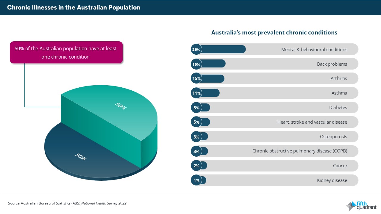 Access pressures in Australia’s healthcare system are most visible among people living with chronic illness. Using a narrower definition of selected chronic conditions, including common and clinically significant diseases, ABS National Health Survey; AIHW Chronic Conditions report around 12.6 million Australians, approximately 50% of the population, were living with at least one chronic conditions according to national health data.