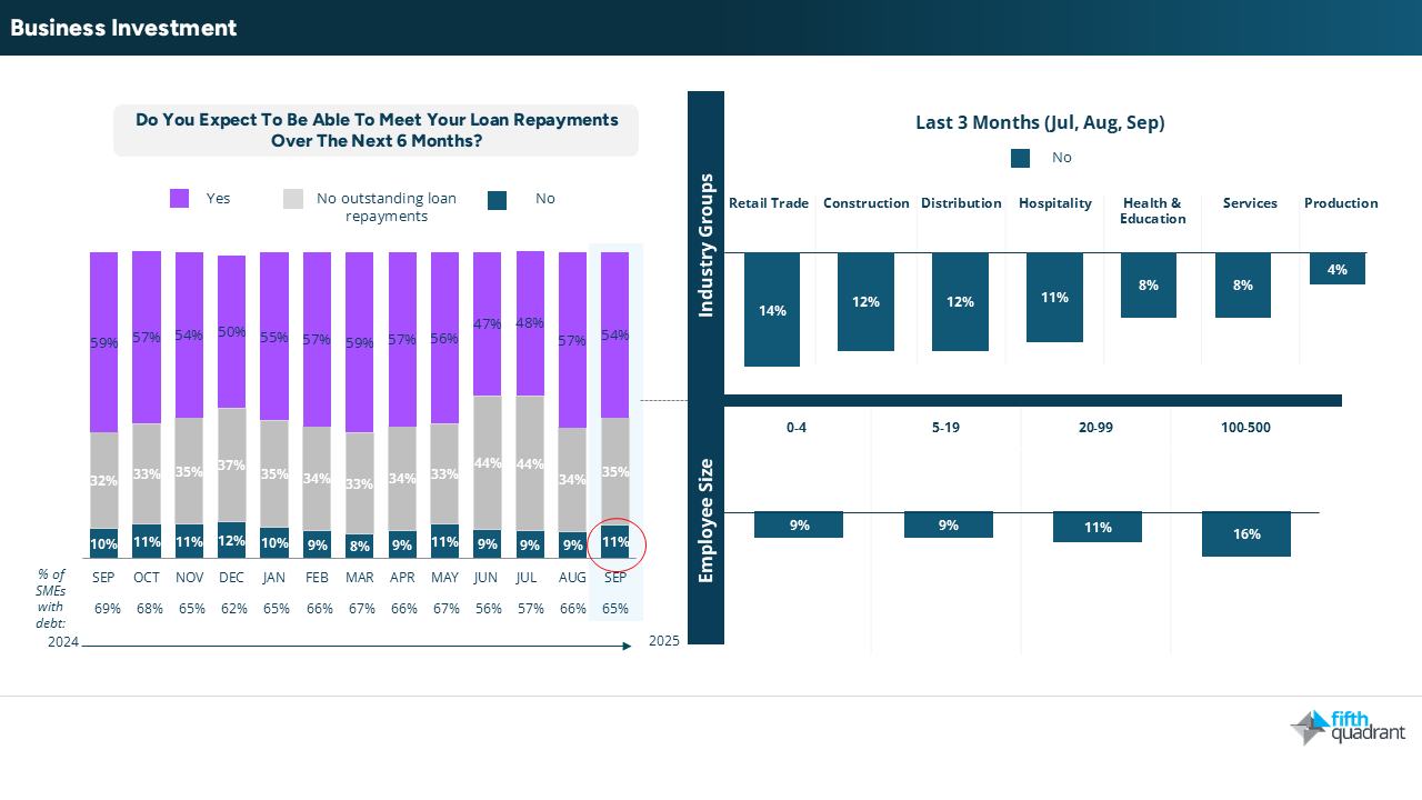 Loan stress increased to 11% in September after three steady months at 9%. The share of SMEs with debt remains consistent at around two-thirds, following a temporary dip during the EOFY period when some businesses cleared or restructured loans.